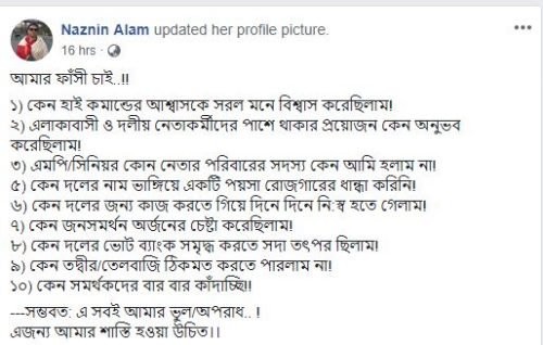 শনিবার সন্ধ্যা ৭টা ১১ মিনিটের দিকে ফেসবুকে ‘আমার ফাঁসি চাই’ শিরোনামে স্ট্যাটাস দেন তিনি। ফাঁসির কারণ হিসেবে ভুল ও অপরাধের ৯ শর্তের বর্ণনাও দেন তিনি। নাজনীন আলম লিখেছেন, ‘আমার ফাঁসি চাই!!