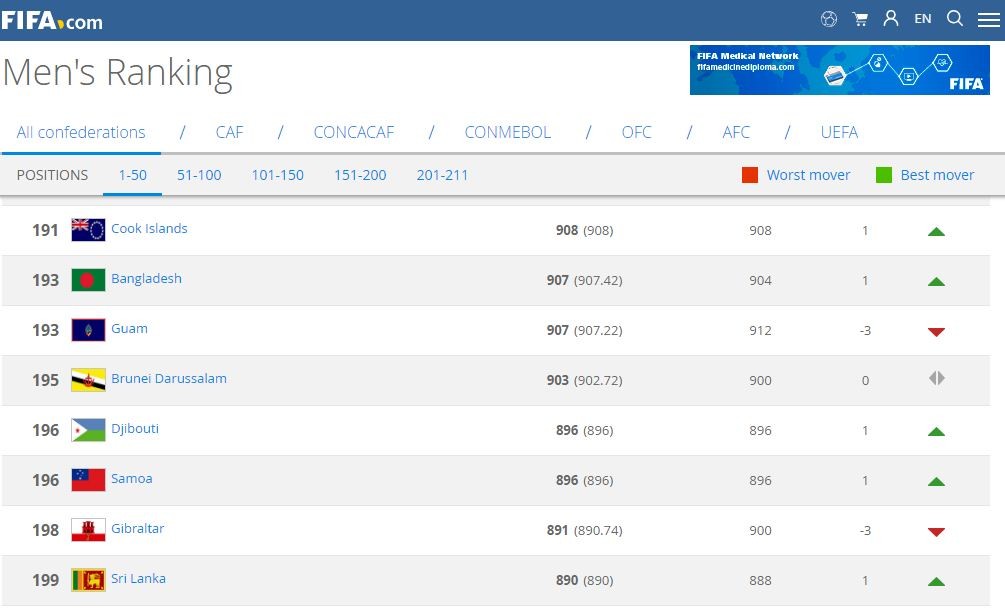 প্রকাশিত ফিফা র্যাংকিংয়ে ৯০৭.৪২ পয়েন্ট পেয়েছে বাংলাদেশ। র্যাংকিংয়ে বাংলাদেশের সর্বোচ্চ অর্জন ছিল ১১০তম স্থান আর সর্বনিম্ন ছিল ১৯৭তম স্থান। মূলত সাফ চ্যাম্পিয়নশিপ ফুটবলে টানা দু’ম্যাচের জয় বাংলাদেশকে এক ধাপ উপরে নিয়ে এসেছে। তবে সাফ চ্যাম্পিয়নশিপ কাপে রানার্স হওয়ার ফিফা র্যাঙ্কিংয়ে একধাপ নেমে গেল ভারত। এখন তাদের র্যাঙ্কিং ৯৭।