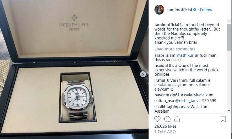 রোববার নিজের ইনস্টাগ্রামে সেই ঘড়ির ছবি পোস্ট করেন তামিম। প্যাকেট ফিলিপের ওই ঘড়ির ছবি নিচে তামিম লিখেছেন, ‘চিঠির কথাগুলো আমাকে ছুঁয়ে গেছে, যেটা আমি ভাষায় প্রকাশ করতে পারছি না। ধন্যবাদ সালমান ভাই।’